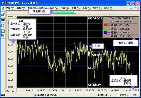 完成記錄儀的各項參數設置,軟件支持聯機狀態下的時時數據和時時曲線顯示,使用軟件可讀取歷史數據