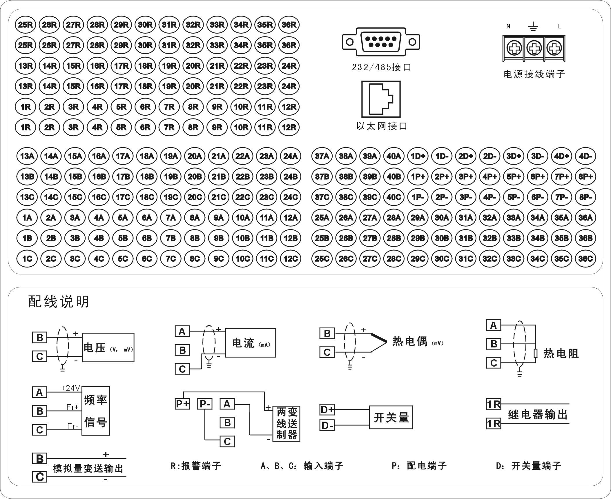 21、輸出:可增加最多36個繼電器輸出,用戶可根據要求自由設定作為其中某通道的上限或者下限,觸點容量3A、220V,默認為常開(該功能為儀表選配功能,定貨需說明)