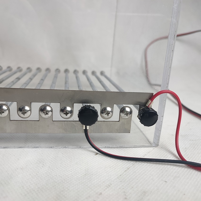 2、刺激箱紅色電線插片緊貼上金屬片安裝,黑色電線插片緊貼下金屬片安裝,兩個(gè)黑色旋鈕擰緊,注意紅色電線露在外面的金屬不要觸碰到黑色電線邊的金屬,黑色電線露在外面的金屬也不要觸碰到紅色電線邊的金屬,防止短路